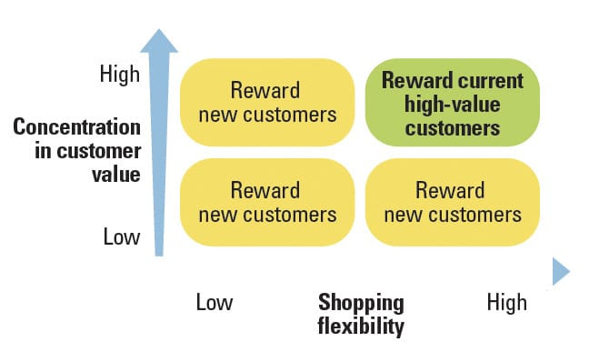 In markets where consumer preferences are highly fluid and where the highest-value customers are much more valuable than others, companies should focus on rewarding their best existing customers. If either of these characteristics is not in place — that is, either the degree to which value is concentrated in the best customers is low, customers’ shopping flexibility is low or both are low — then managers should focus on rewarding new customers